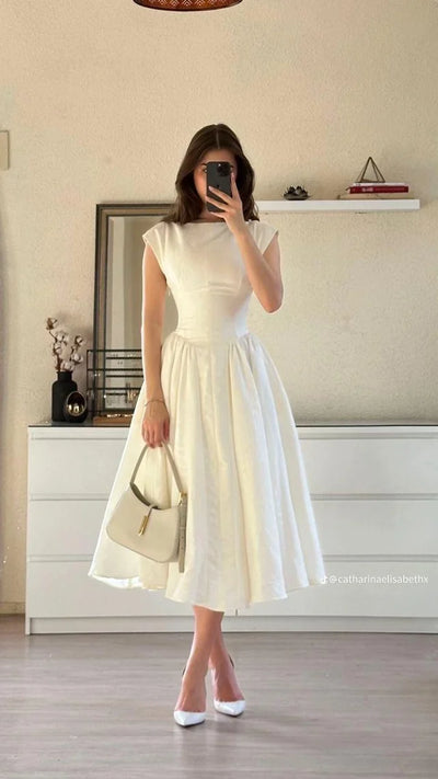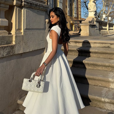 The Edith Midi Dress is a stunning choice for winter weddings, engagement celebrations, and refined formal events. Crafted from luxurious moiré satin, this full-skirted midi silhouette flows beautifully with every step, while the backless design and dropped shoulders add a modern, quietly confident edge. Finished with a soft tulle underskirt that peeks through as you move, Edith is made for graceful entrances, candlelit moments, and occasions where less says more.